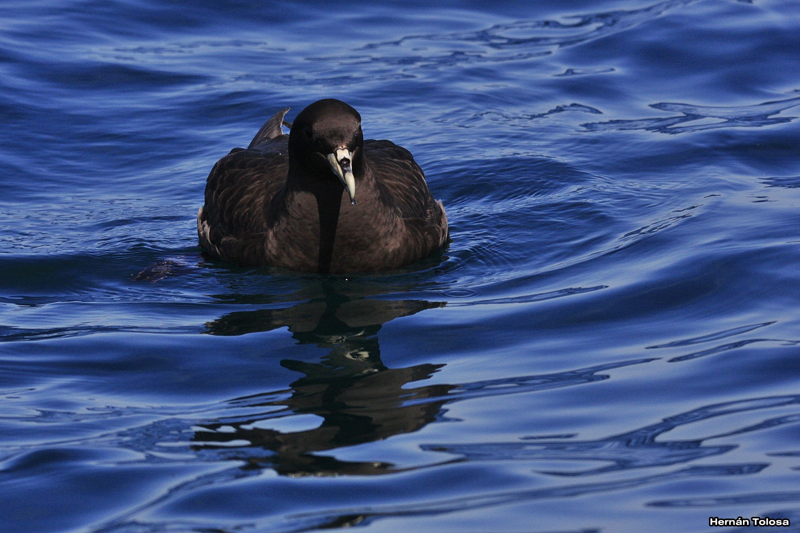 Un ave pelágica que pude ver nuevamente en mi segunda salida en Mar del Plata en diciembre de 2017 fue el petrel barba blanca (Procellaria aequinoctialis). Había varios comiendo peces cera de un barco pesquero, por lo que al principio parecían satisfechos y no se acercaban mucho cuando le arrojábamos cebo, aunque de todos modos minutos más tarde algunos ejemplares se acercaban a nuestro barco y terminaron comiendo parte del calamar que se le arrojaba al agua por la borda. Fue lindo ver como se alimentaban y en ocasiones se disputaban su comida con otras aves.