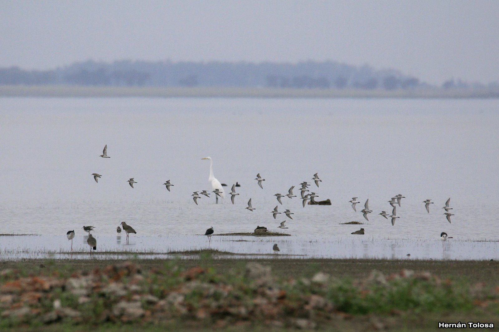 Si bien partimos desde San Luis a pleno sol hacia el oriente el tiempo iba desmejorando y ya en Melincué comenzó a cubrirse mucho más e incluso a caer una muy débil llovizna, lo que deslució las imágenes que podíamos tomar. Había una playa extensa y no era sencillo acercarse a las aves, solamente con paciencia haciendo "pasos de ganso" o caminatas cortas agachado, alternando con momentos en cuclillas, lo que provocaba con el paso de los minutos molestias en las piernas.